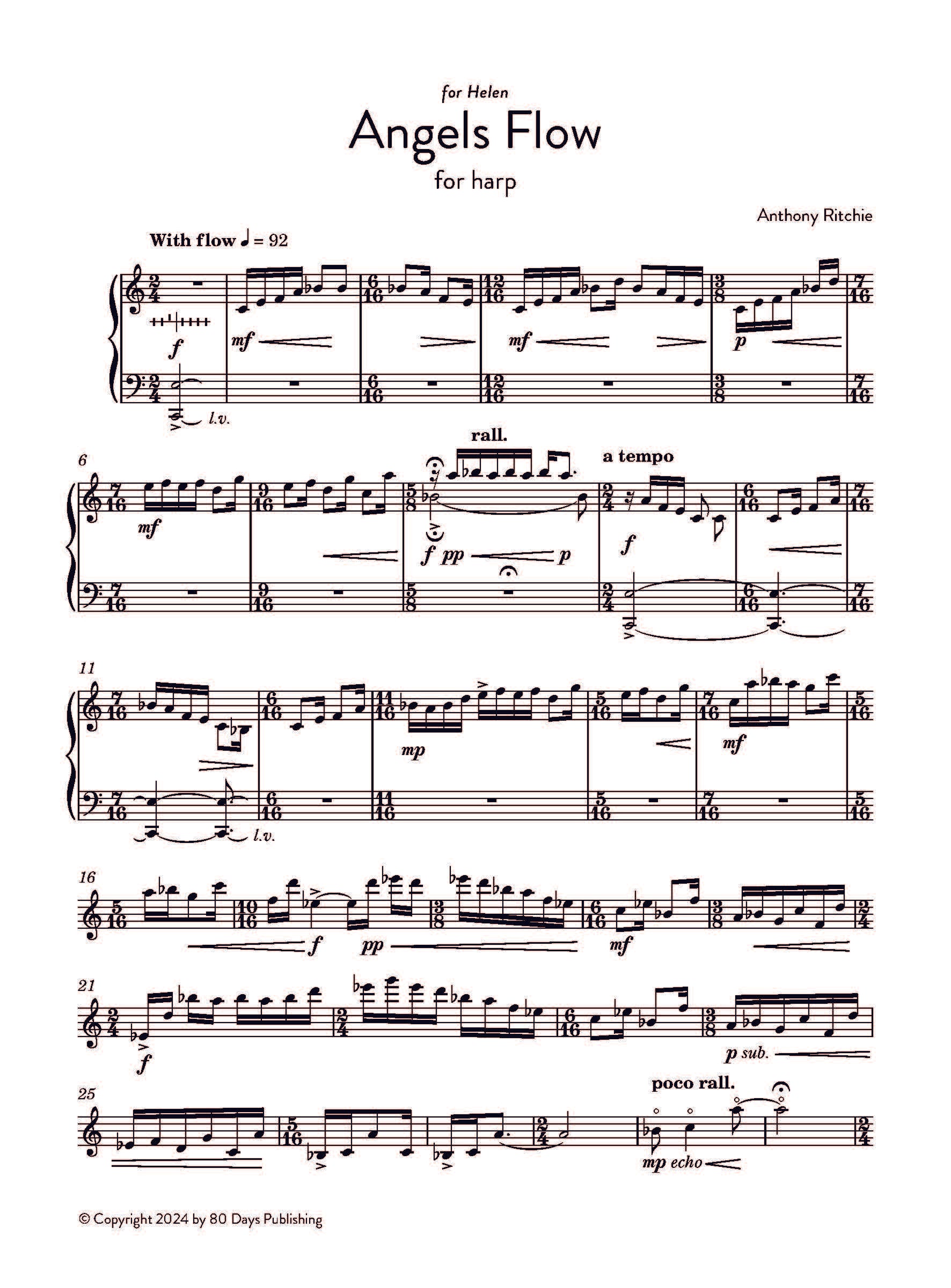 rest at the end, as the music descends to the lower register of the harp. This piece was commissioned by Helen Webby,